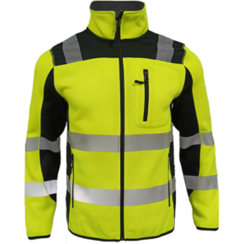 Ryškiaspalvis, šviesą atspindintis džemperis darbui. Užtrauktukas su smakro apsauga. Elastiniai rankogaliai ir gaminio apatinė dalis. Horizontalios šviesą atspindinčios juostos priekyje, nugaroje ir ant rankovių. Dvi kišenės juosmens srityje ir viena kišenė krūtinės srityje.