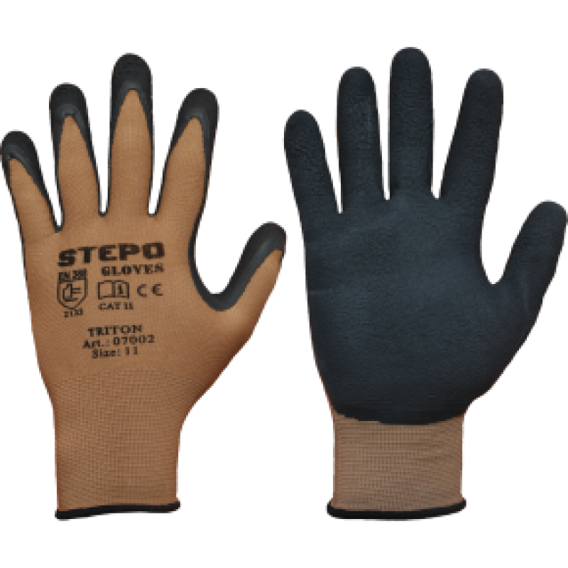 Nailoninės minkštu porėto latekso sluoksniu aplietos pirštinės TRITON. Gerai priglunda prie rankos, puikiai sukimba tiek su sausais, tiek su šlapiais paviršiais. Ilgaamžės, lanksčios ir patogios. Pasižymi itin geromis mechaninio atsparumo savybėmis.