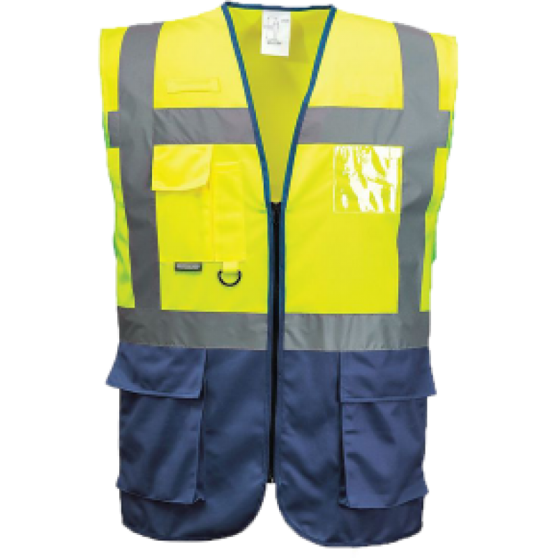 Signalinė liemenė C476 su horizontaliomis ir vertikaliomis šviesą atspindinčiomis juostomis. Daug įvairaus dydžio funkcionalių kišenių, specialus įdėklas ID kortelei. Užsegama užtrauktuku.